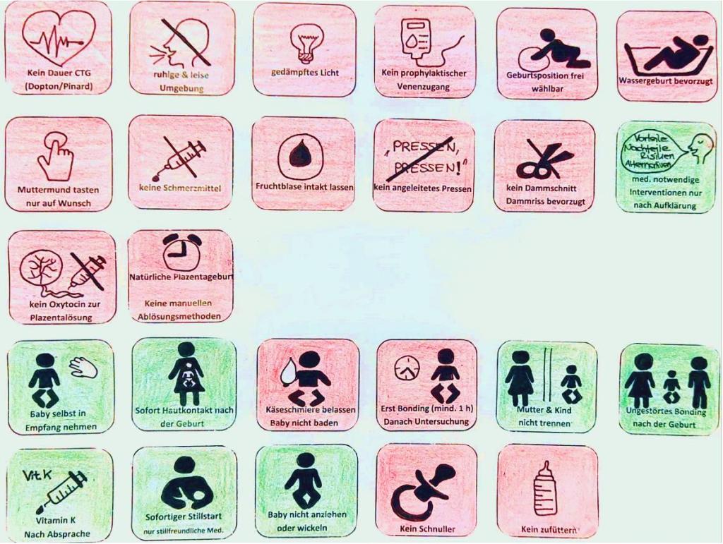 Für weitere Anregungen findest du auf Pinterest einige Beispiele! Suche am Besten unter folgenden Schlagwörtern: birth plan icons, birth preferences icons