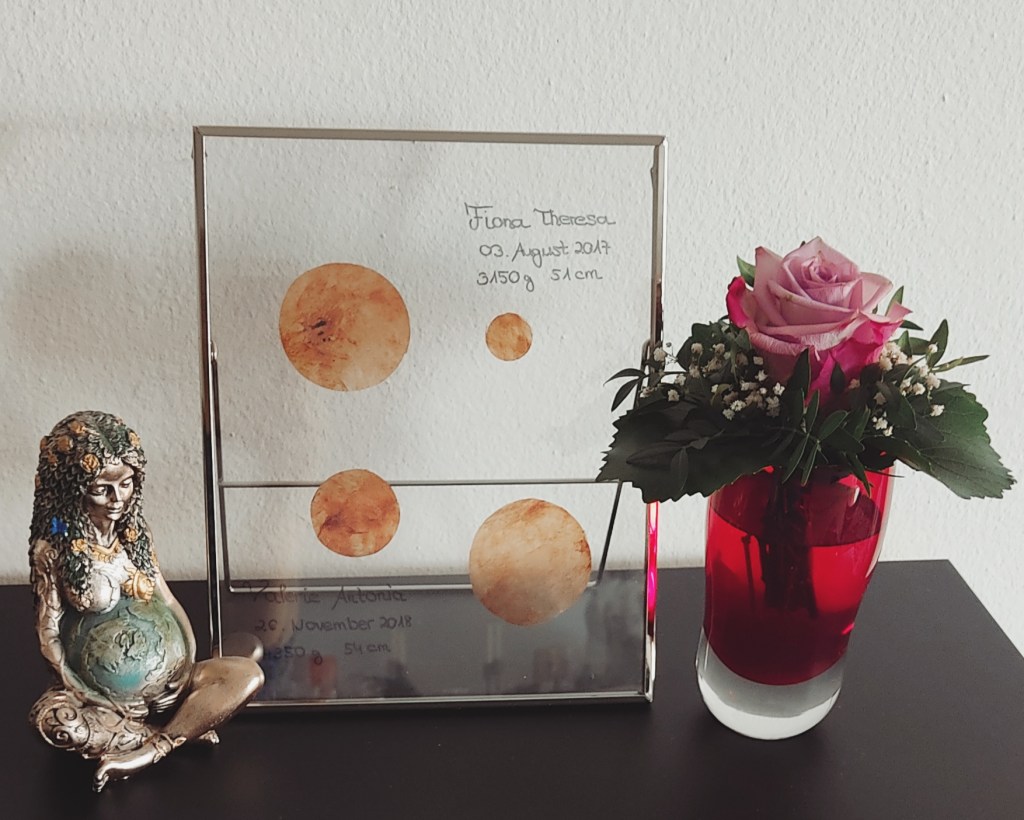 Gerne stelle ich dir einen oder mehrere sog. Amnionmond(e) her und positioniere dir diese entweder auf Leinwand oder in einem Glasbilderrahmen.